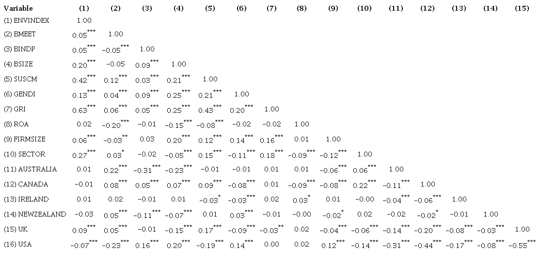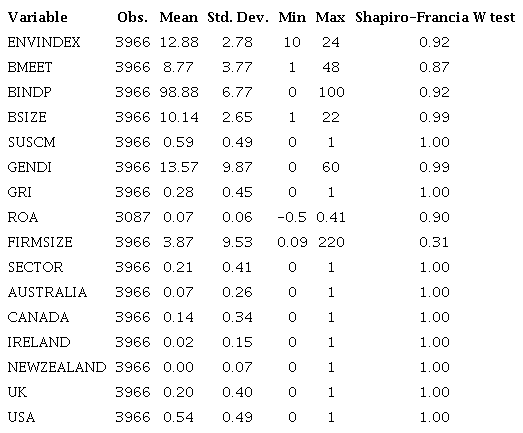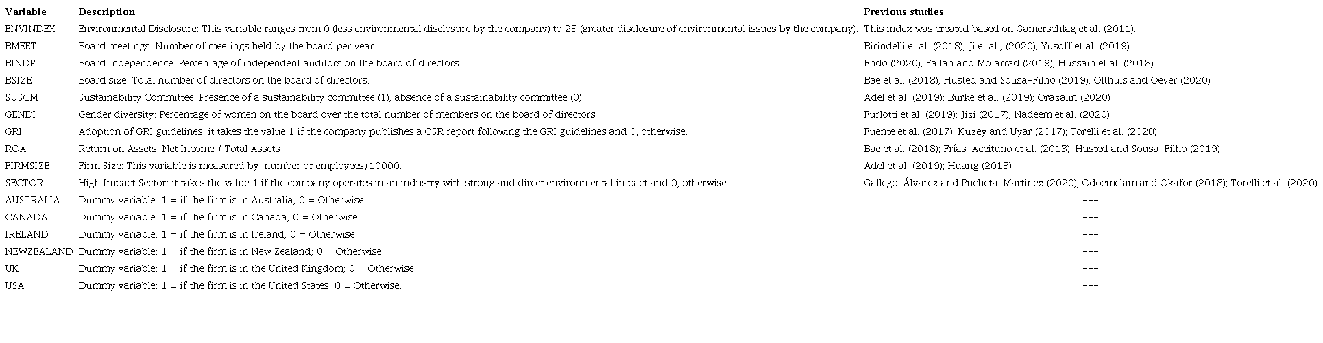 The study’s independent variables are the attributes of the board - number of board meetings, board independence, board size, sustainability committee, and gender diversity. These attributes were selected because they are important in determining environmental policies, as shown in previous studies (Shahbaz et al., 2020; Shaukat et al., 2016). We adopted the GRI guidelines, Return on Assets, firm size, and industry as control variables. As countries are in different geographic locations, the country effect has also been used as a control variable. Table 3 shows each of the variables used in the study and how they are measured.