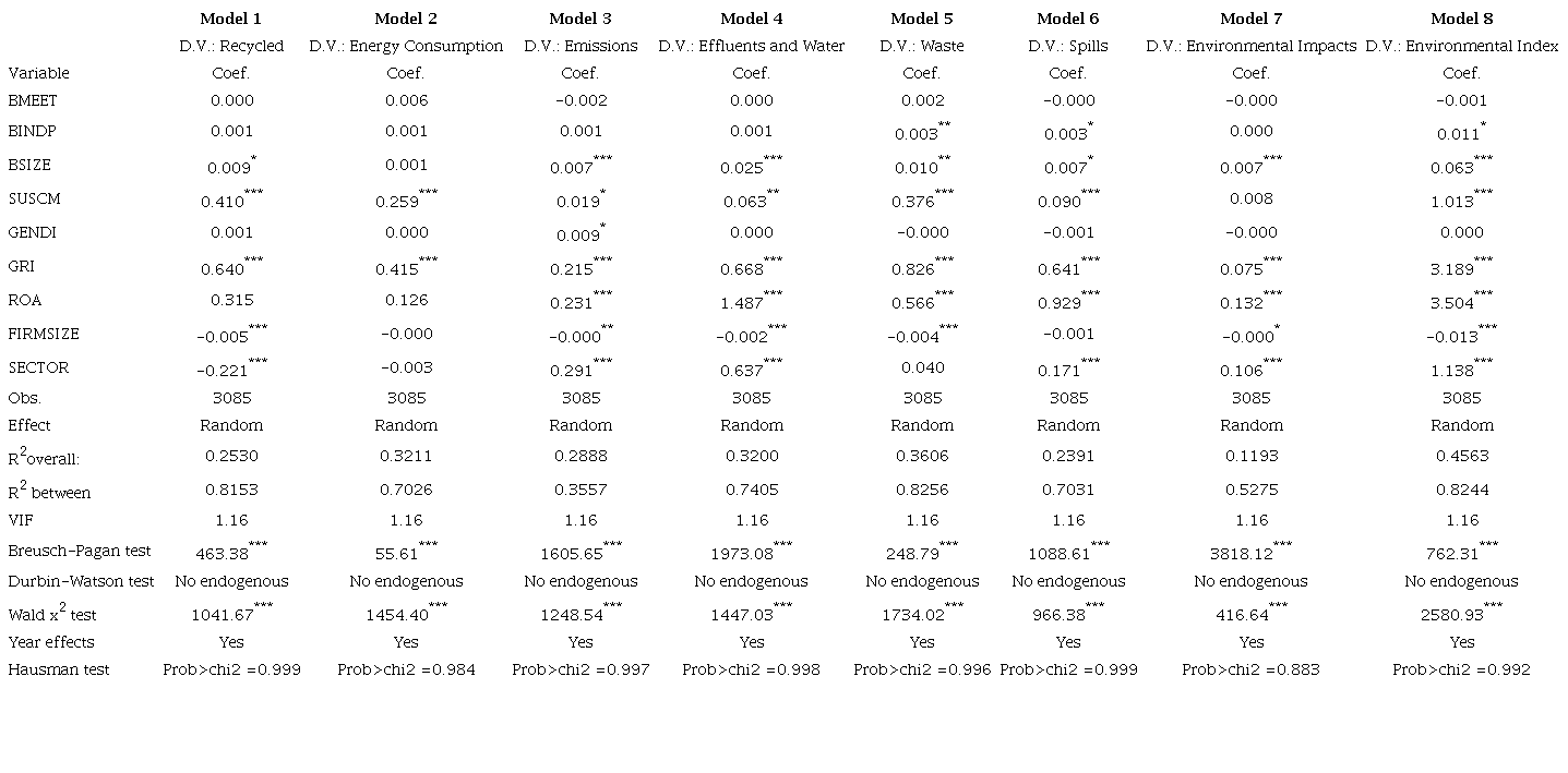 To test the hypotheses developed, we operationalized eight models. First, we segregated the environmental index into eight parts - the eight pillars of environmental disclosure. Except for biodiversity, each pillar was taken as a dependent variable (D.V) in a model. Most companies did not have an extensive disclosure in this environmental pillar, which influenced our tests because when operationalizing the model, the variables were omitted. In Model 8, we present the results for the environmental index. Table 6 shows the results of the multivariate analysis.