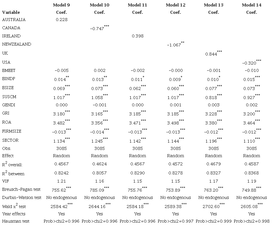 The results confirm the signs obtained in the previous models, demonstrating stable findings. Companies based in Canada, New Zealand, and the United States tend to have less environmental disclosure. This finding is interesting since the United States has great environmental biodiversity. In contrast, when companies are headquartered in the UK, they are more proactive in environmental disclosure.