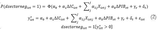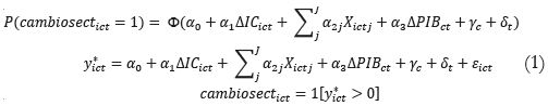 (1)La variable cambiosectict es una variable indicadora que toma el valor uno si el trabajador i, del área metropolitana c, observado el año t, cambió de sector entre su trabajo anterior y su trabajo actual. La variable ΔIC mide la variación en el grado de integración comercial en el departamento correspondiente al área metropolitana c entre el año de observación y el año del último trabajo. Se puede medir el grado de integración comercial de diferentes formas; la más común es el coeficiente de apertura, pero dados los datos disponibles y los instrumentos utilizados para corregir la endogeneidad del modelo (ver más abajo), se elige el ratio de las importaciones sobre el PIB. Xict es un vector de J características individuales de los trabajadores susceptibles de influir en la probabilidad de que cambien de sector (modelo (1)) o que cambien de sector y terminen en un sector de menor productividad (modelo (2) más abajo). ΔPIBct mide la variación anual del PIB en el departamento asociado al área metropolitana c. ΔPIBct constituye una buena aproximación de las variaciones del ciclo económico de las áreas metropolitanas, dada la preponderancia del PIB de éstas en el PIB departamental. Por último, γc y δt corresponden, respectivamente, a los efectos fijos de área metropolitana y de año.