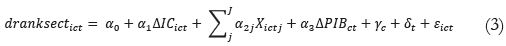 En el modelo (2), puesto que la variable dependiente dsectorneg mide los flujos netos de trabajadores hacia sectores de menor productividad, se excluyen los trabajadores que llevan menos de un año en la firma pero que no cambiaron de rama de actividad. La significancia del efecto de la variable ΔIC podría estar condicionada a la exclusión de esta población de la muestra. Para descartar esta posibilidad, se estima el modelo alternativo (3), en el cual la variable dependiente dranksectict corresponde a la diferencia entre el ranking del sector actual y el del sector anterior. Esta variable toma valores positivos en caso de transiciones hacia sectores de menor productividad, negativos en caso de transiciones hacia sectores de mayor productividad y toma el valor cero si el trabajador no cambió de sector. Además de incluir la población de trabajadores que no cambiaron de sector, la especificación (3) presenta dos ventajas: permite una mayor varianza de la variable de resultado, y su variable dependiente incluye, parcialmente, una dimensión de intensidad. Mayores valores de dranksectict tienden a indicar un diferencial de productividad más importante entre el sector de origen y el sector actual.