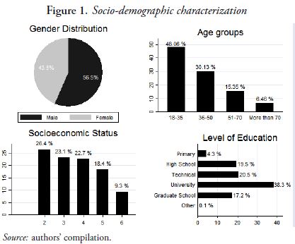 Figure 1 shows some of the general characteristics of the sample. By sex, the sample included 56.53% of men and 43.47% of women; nearly half of the respondents are in the range of 18–35 years old. By socioeconomic status, socioeconomic stratum 2 has the highest share while the socioeconomic stratum 6 the lowest. By educational level, 38.31% of the sample holds a university degree, followed by 20.52% that are technicians or technologists, 17.52% with postgraduate training, and about 24% has secondary education or less.