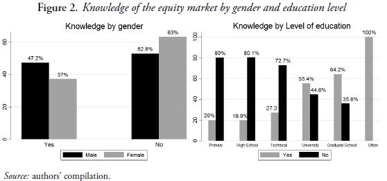 Regarding the level of financial literacy, 52.7% of the respondents state that they do not have any knowledge of the equity market and its investment instruments (Figure 2), that is, 6 out of 10 respondents do not recognize that market. This lack of knowledge is accentuated when referring to specific funding instruments (70.47%). Additionally, only 16.5% is aware of the existence of the NSEFE.7 In terms of gender, the data show a gender gap in terms of lack of knowledge in regard to the equity market: 63% for women and 37% for men. Moreover, a direct relation is shown between knowledge of the equity market and respondents' education level. This relation is closer when the knowledge level of the equity market and the proportion of people who have a stake in the equity market are examined (Figure 3).