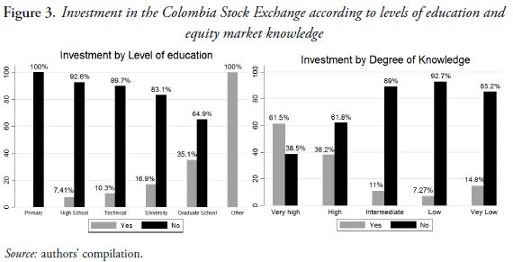 Our results show that knowledge of the equity market is higher in older individuals with postgraduate education. For the case of Colombia, and even more so in Barranquilla, this reinforces the fact that the equity market is a very exclusive one that remains reserved for a minority with specific knowledge and resources. Especially, the highest level of knowledge and participation in this market is represented by socio–economic strata 4 to 6 from the North Central and Riomar historical locations.