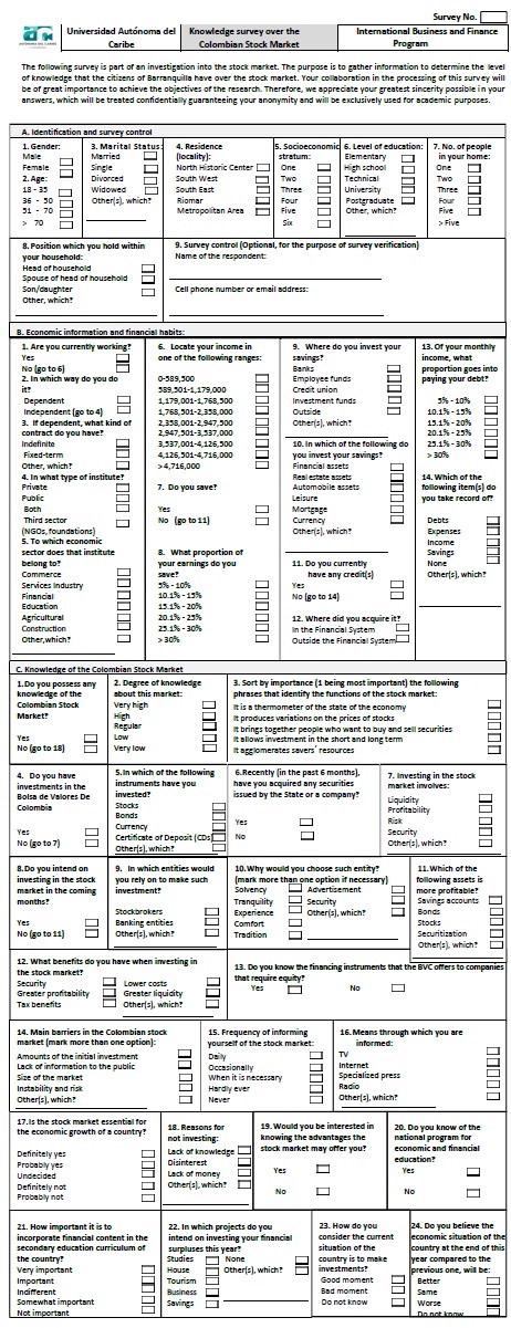 For the empirical study, a questionnaire with specific and complementary information regarding the citizens' characteristics and their financial situation was constructed. This instrument is divided into three sections and includes multiple–choice closed questions, as well as dichotomous, scalar and valuation questions. In the first section, the citizen's socio–demographic characteristics are explored. In the second section, we investigate their economic information and financial habits. In the third section, the level and the factors that favor or condition their ownership and knowledge of the Colombian equity market are analyzed.