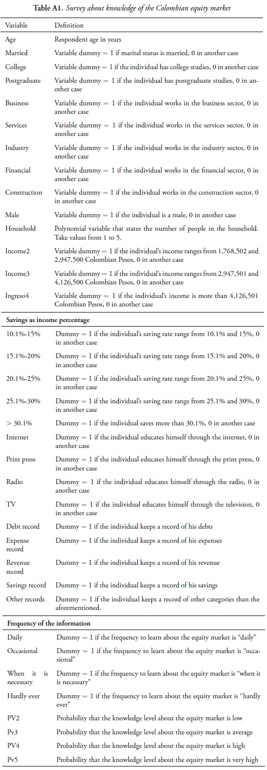 The majority of the activities carried out in the Colombian securities market are focused on the performance of products traded in the stock market and on the analysis of specific products using several assessment techniques. Evidence from empirical studies on citizens' knowledge about the equity market in Colombia is null; hence, this study significantly contributes to the literature since it characterizes the socioeconomic profile and identifies the knowledge level that citizens of the Colombian city of Barranquilla have in regard to the equity market,3 as well as the factors that explain participation in this market. This study takes as reference the one developed by Van Rooij, Lusardi and Alessie (2011), and empirically analyzes the knowledge and understanding scales of the equity market using a binomial and ordinal logit model. The probability of investment is also assessed based on several variables such as income, education, savings, and social stratum, among others. This additional information allows characterizing the economic profile of the citizens of Barranquilla.