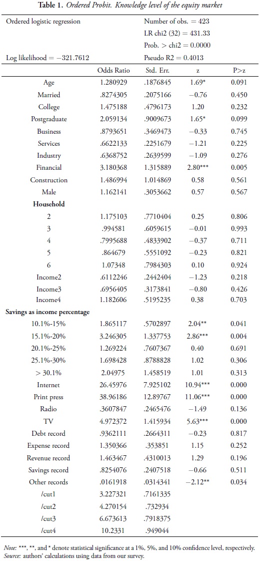 To examine the factors that influence the knowledge and participation of Barranquilla's private investors in the equity market, we proceed to run two discrete choice models (ordered and binary logit) in order to analyze: (i) The variables that influence individuals' knowledge of the equity market; and (ii) the variables that influence the likelihood of investing in the Colombia Stock Exchange (BVC).