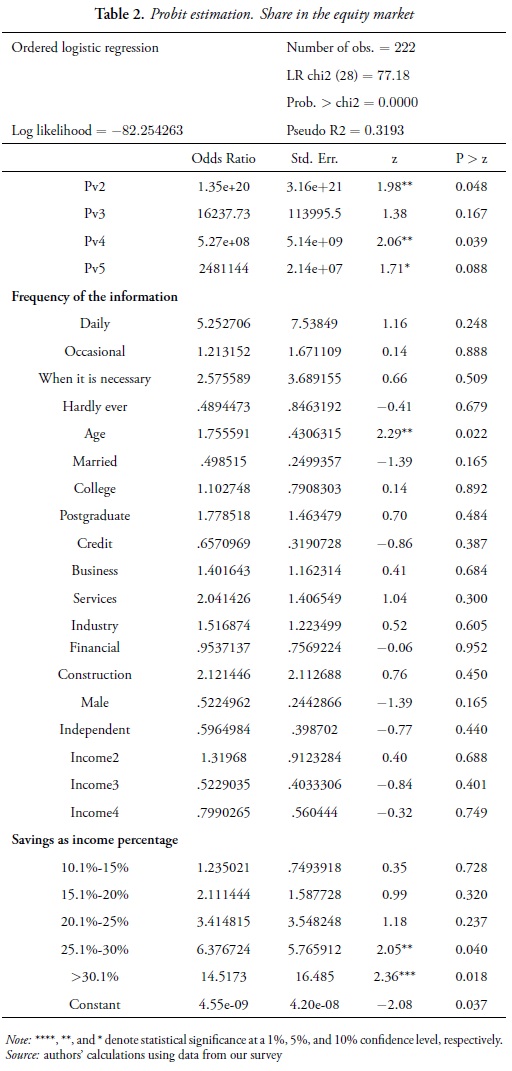 Source: authors’ calculations using data from our survey.As expected, with regard to the financial variables, the higher the possibility of actual investment in the equity market, the greater is the knowledge of potential investors. While the variables related to wage levels have no significant influence, savings capacity does have it. To have a higher level of savings has a positive effect on the probability of knowing the equity market, in contrast with those people who do not save (ceteris paribus). This seems to coincide with the findings of Bernheim et al. (2001). The probability that people who are able to save between 10 and 15% and between 15 and 20% of their income have knowledge of the equity market is 0.62 and 1.17 times higher, respectively, than the probability of those who have no savings capacity at all.