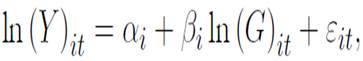 (1)donde ln (Yit ) es el logaritmo del PIB de cada departamento (i) en el año (t) y ln (Git ) es el logaritmo del gasto público de cada departamento (i) en el año (t). Los subíndices i y t están definidos (i = 1, . . . , N )(t = 1, . . . , T ). Adicionalmente, c es el término de error independiente idénticamente distribuido con media cero y varianza constante