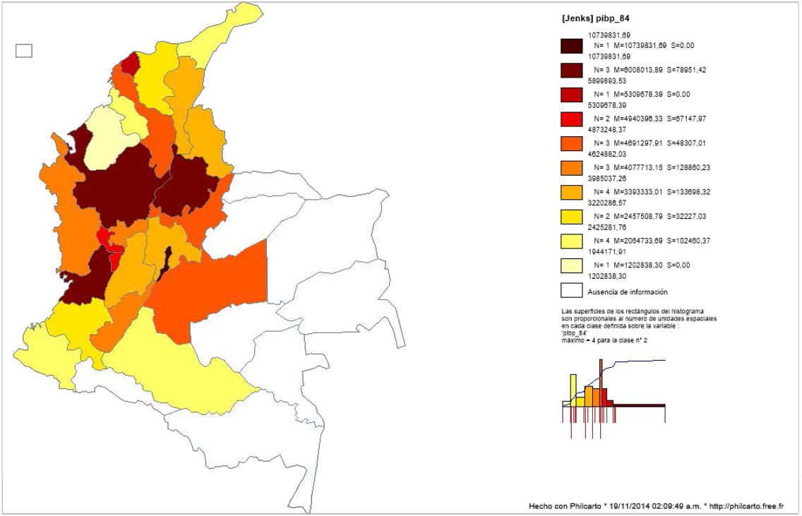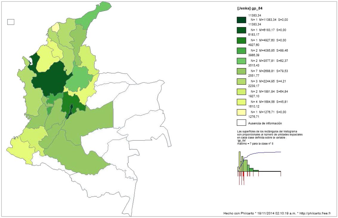 En el Mapa 1 se muestra el nivel de PIB real per cápita a través de la división política departamental de Colombia (incluida Bogotá) para el año 1984, mientras que el Mapa 2 presenta el gasto público real per cápita. La intensidad del color indica mayor nivel de PIB o gasto público, según sea el caso. Se observa un mayor nivel de PIB per cápita en Bogotá, Antioquia, Valle del Cauca y Santander y un mayor nivel de gasto público per cápita en Bogotá, Antioquia, Valle del Cauca y Santander.