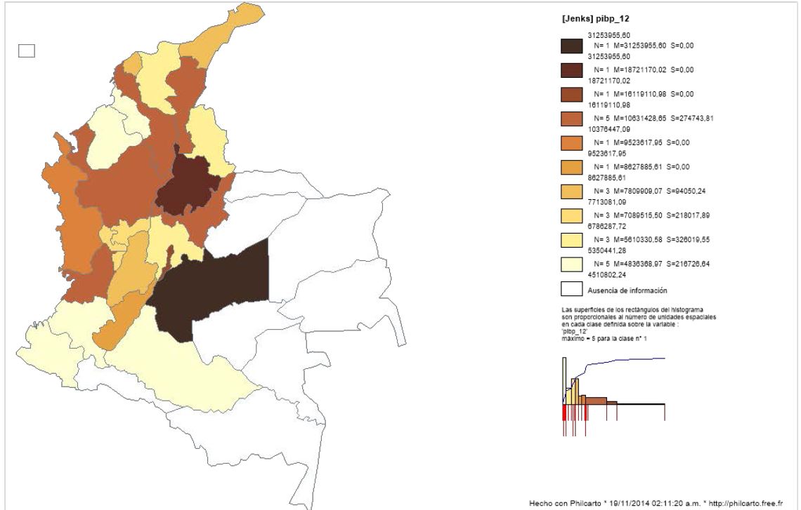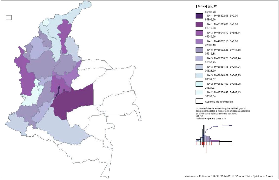 Así mismo, el Mapa 3 y 4 muestran, respectivamente, el PIB y el nivel de gasto público real per cápita a través la división política departamental de Colombia (incluida Bogotá) para el año 2012. Se observa un mayor nivel de PIB per cápita en Meta, Santander y Bogotá, y un mayor nivel de gasto público per cápita en Bogotá, Meta y Cesar.