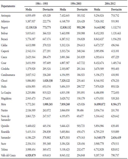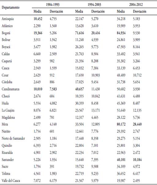 Los departamentos considerados en el estudio fueron: Antioquia, Atlántico, Bolívar, Boyacá, Caldas, Caquetá, Cauca, Cesar, Córdoba, Chocó, Cundinamarca, Huila, La Guajira, Magdalena, Meta, Nariño, Norte de Santander, Quindío, Risaralda, Santander, Sucre, Tolima, Valle del Cauca y la ciudad de Bogotá.3 En la Tabla 1 y Tabla 2 se presentan algunas estadísticas descriptivas (media y desviación) de las series empleadas por departamentos y decenios (1984-1993; 1994-2003; 2004-2012). Se observa en la Tabla 1 que el PIB real per cápita de Bogotá ha presentado el mayor valor promedio y volatilidad con respecto al resto de departamentos durante los tres periodos de observación. Durante el decenio 1984-1993 los departamentos de Chocó y Meta se caracterizaron por presentar la mayor volatilidad en el Ingreso real per cápita. Meta y Santander presentaron durante el periodo 2004-2012 la volatilidad del PIB per cápita más alta, lo cual puede ser explicado por el incremento de las extracciones minero-energéticas en estos departamentos. Por último, el departamento de Córdoba presentó el menor Ingreso per cápita en los tres decenios.