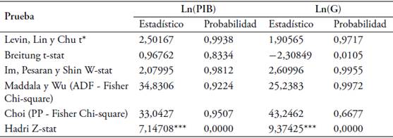 Para determinar el orden de integración de las series de tiempo PIB y gasto público se emplean las pruebas de raíces unitarias Im, Pesaran y Shin (IPS) (2003) , Levin, Lin y Chu (LLC) (2002), Breitung (2000), Maddala y Wu (1999) -Fisher tipo Dickey y Fuller (1979, 1981)-, Choi (2001) -Fisher tipo Pillips y Perron (1988)- y Hadri (2000) -Tipo Kwiatkowski et al. (1992)-.5Estas pruebas tipo datos de panel por un lado mejoran las propiedades de los estimadores y, por otro lado, corrigen la heterogeneidad no observada que está presente en los datos de panel.