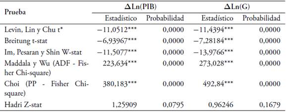 En la Tabla 4, se exponen los resultados de las seis pruebas de raíces unitarias aplicadas a las series primeras diferencias, con el fin de confirmar el orden de integración de cada serie de tiempo y descartar la existencia de más de una raíz unitaria. Se observa que, según las probabilidades asociadas a los estadísticos de prueba, es posible rechazar la hipótesis nula de las pruebas LLC, IPS, Breitung, Maddala-Wu y Choi al 5 % de significancia, la cual sostiene que las series del PIB y del gasto público en primeras diferencias tienen raíz unitaria; en cambio, no es posible rechazar la hipótesis nula de estacionariedad en las series según la prueba de Hadri (2000) al 5 % de significancia. Estos resultados indican que las series del PIB per cápita y del gasto público son series integradas de orden 1.