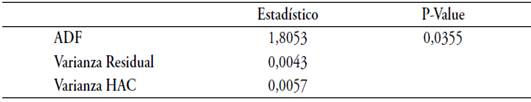 La existencia de esta relación de largo plazo buscar evitar que se estimen relaciones espurias4 (Granger & Newbold, 1974), además de posibles problemas de endogeneidad en el modelo. Si se determina que existe cointegración entre las variables, se estima la siguiente relación: