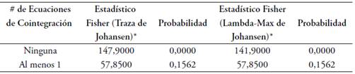 En la Tabla 5 se presenta el resultado de la prueba de cointegración de Kao (1999), la cual establece que las series están cointegradas con una significancia del 1 %, ya que permite rechazar la hipótesis nula de no cointegración a favor de la hipótesis alterna de que existe cointegración en el panel. Por su parte, la Tabla 6 se exponen los resultados de la prueba tipo Fisher Johansen, la cual, según el estadístico tipo lambda-max, se puede rechazar la hipótesis nula de que el número de ecuaciones de cointegración es cero al 5 % de significan- cia mientras que no permite rechazar la hipótesis nula de que el número de ecuaciones de cointegración es a lo sumo uno, con esto se establece que existe un vector de cointegración entre las 2 variables con un 95 % de confianza.