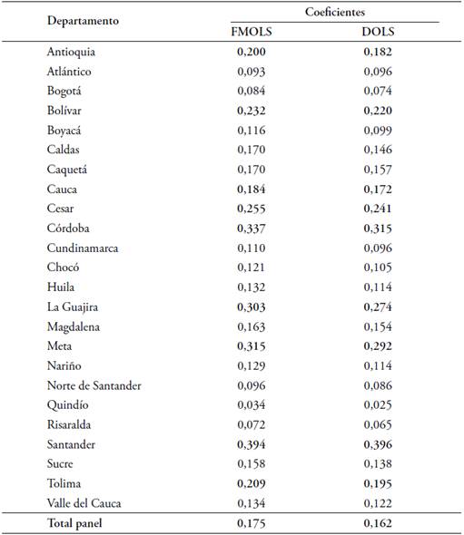 Los vectores de cointegración estimados entre el gasto y el PIB departamental muestran que para el caso de los departamentos de Santander, Córdoba y La Guajira el aumento del Gasto público tiene un efecto mayor sobre el PIB que en el resto de departamentos. Por su parte, los departamentos de Quindío, Risaralda, Bogotá D.C., Atlántico y Norte de Santander presentan los coeficientes más bajos. No obstante, a nivel del panel regional, un incremento del 1 % en el Gasto Público genera incrementos del PIB en 0,175 %, en el largo plazo.