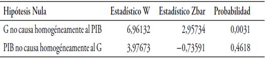 Por su parte, la prueba de causalidad de Granger para panel propuesta por Dumitrescu y Hurlin (2012) aporta un resultado interesante para la literatura empírica sobre el enfoque keynesiano y la Ley de Wagner. Con respecto a esta última, los resultados empíricos exponen que para los datos y el periodo de estudio, el gasto público (G) no causa homogéneamente al PIB.