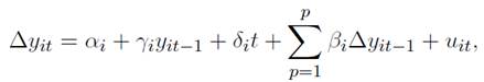 Las pruebas IPS (2003), LLC (2002), Breitung (2000), Maddala y Wu (1999) y Choi (2001) tienen como hipótesis nula probar que la serie tiene raíz unitaria, versus la hipótesis alterna, en la que se considera que la serie de tiempo no tiene raíz unitaria. Estas pruebas se basan en la siguiente especificación: