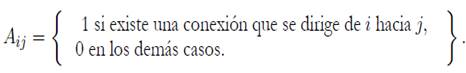 Una red, o grafo, representa las conexiones entre los elementos de un sistema. La representación más sencilla de una red es la matriz de adyacencia. Si n representa el número de vértices o participantes, la matriz de adyacencia A es una matriz cuadrada asimétrica de dimensiones n x n, tal que el elemento cumple con