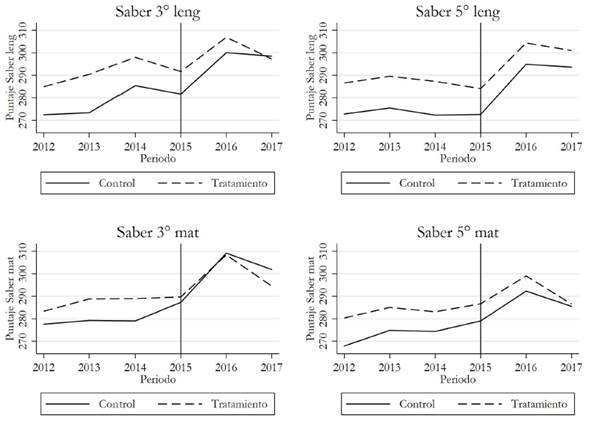 El Gráfico 1 muestra las tendencias de los puntajes en las pruebas Saber 3° y Saber 5° en las áreas de Matemáticas y Lenguaje, con el fin de comprobar el supuesto anteriormente mencionado. Se puede evidenciar que el supuesto de tendencias paralelas es creíble hasta antes del momento de la aplicación del tratamiento (i.e. 2015) en cada una de las pruebas en los diferentes grados.