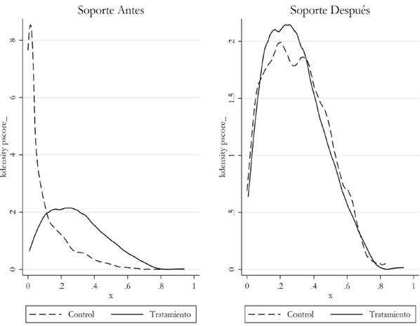 Teniendo esto en mente, se realizó un proceso de emparejamiento, con el objetivo de hacer comparables los grupos de control y tratamiento y así reducir los sesgos presentes en la estimación. El método de emparejamiento empleado fue el Entropy Balancing, propuesto por Hainmueller (2012), mediante el cual se calcula de manera directa el peso que se le deben dar a las observaciones del grupo de control, usando restricciones sobre el balance de las covariables empleadas (i.e., igualdad de medias, igualdad de varianzas y/o igualdad en asimetrías). En este trabajo únicamente se empleó la restricción de igualdad de medias. Con esta metodología se garantiza la comparabilidad del grupo de control y el grupo de tratamiento en términos de sus características observables. El Gráfico 2 muestra el soporte común antes y después del emparejamiento, evidenciando que después de los arreglos la distribución de probabilidad de pertenecer al grupo de tratamiento es casi igual para ambos grupos.