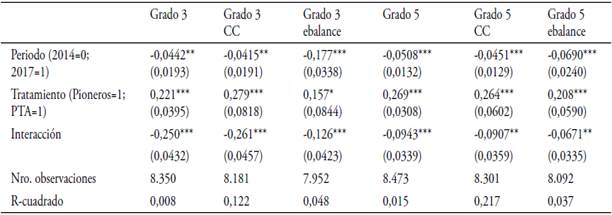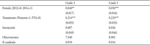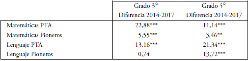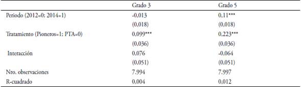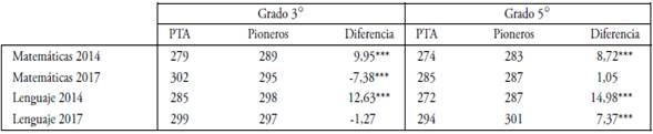 Los datos expuestos en la Tabla 1 muestran que, en promedio, los colegios Pioneros para el año 2014 obtuvieron mejores resultados que los colegios del PTA en todos los grados y pruebas. Por otro lado, la Tabla 2 muestra las diferencias estadísticas de los resultados en el tiempo entre ambos grupos. Se evidencia que, aunque ambos lograron mejorar su desempeño, la magnitud del incremento fue muy superior para los colegios del PTA 2.0 (grupo de control) que para los colegios Pioneros. Esto podría estar evidenciando que la estrategia Colegios Pioneros no tiene un efecto mayor al de la estrategia original.6