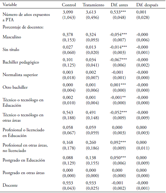 De esta forma, las variables que se usaron para realizar el emparejamiento abarcan el número de años que el establecimiento estuvo en el PTA, la distribución por género de los profesores, así como sus niveles de educación, las áreas y niveles educativos en los que enseñan, entre otros. Es decir, las variables que se utilizaron para realizar el emparejamiento fueron características de los profesores de cada establecimiento educativo. 8