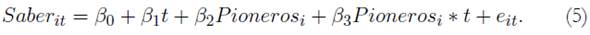 es una variable dicótoma que toma el valor de 0 para los establecimientos del PTA y de 1 para los establecimientos que hacen parte de la estrategia Colegios Pioneros del PTA. El término de interés en este caso es el estimador