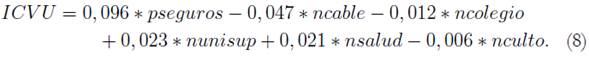 la constante y el término de error, respectivamente. Bajo estos supuestos, ceteris paribus, las viviendas con acceso a un mayor número de amenities deben ser más costosas, y el diferencial de precio constituye una medida de su valor expresado a través de la transacción. Estos precios implícitos, representados por los coeficientes de la regresión (2), pueden utilizarse para calcular un Índice de Calidad de Vida Urbana (Blomquist, 2005). En este caso es posible calcular para cada área la contribución implícita de cada una de las n características del barrio: