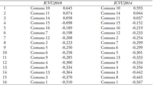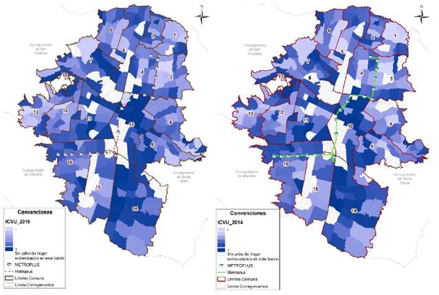 En concordancia con los planteamientos teóricos, el ICVU por barrios y comunas está positivamente correlacionado con el precio, lo que indica que las personas están dispuestas a pagar más por tener acceso a los amenities que tienen un efecto positivo sobre su CVU. El índice de autocorrelación espacial7 del ICVU en 2010 y 2014 es de 0,19 y 0,11 respectivamente, que al ser distinto de cero indica que los barrios con mayor nivel de CVU tienden a estar cerca unos de otros. Igualmente, muestra que en la ciudad la segregación socioeconómica de la CVU tuvo una leve reducción en el periodo estudiado.