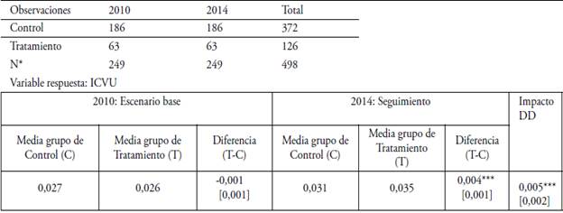 es la variable que define el momento de la intervención y toma un valor de 1 una vez se ha hecho. La forma funcional elegida implica que los resultados expresan los efectos de las variables sobre tasas de crecimiento. Para las comparaciones de calidad de vida urbana se tomaron los coeficientes del vector de amenities como plantea la ecuación (4) y luego, utilizando el modelo simple de diferencias en diferencias, se ha calculado el impacto de la accesibilidad al Metroplús sobre la CVU.