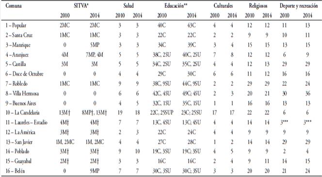 Se observa que, en ambos periodos, los amenities de transporte, salud, educación, cultura, culto, recreación y deportes parecen estar distribuidos equitativamente a lo largo del territorio. Sin embargo, las estaciones del SITVA no tienen presencia en las comunas 6, 7, y 8, de estrato bajo, ni en la 9, de estrato medio bajo. Al estudiar las áreas de influencia de cada estación del SITVA6, quedan por fuera del radio de influencia las comunas 6 y 9; además, aunque se encuentra en el área de influencia del Metro y del Metrocable, en la comuna 7 más del 80% de los hogares entrevistados no tiene fácil acceso al sistema. Respecto al acceso al Metroplús, el análisis por áreas de la ciudad permite ver que las tres zonas de mayor influencia del sistema son la nororiental, de estrato predominantemente bajo, y la centro-oriental y suroccidental, de estrato predominantemente medio bajo.