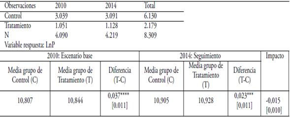 El análisis descriptivo de los datos de la ECVM2010 y ECVM2014, separado entre el área de tratamiento y de control en los escenarios base y de tratamiento respectivamente, permite ver que la media de los precios de alquiler de vivienda es mayor en el área de tratamiento tanto antes como después de la puesta en marcha del Metroplús. A pesar de esto, las tasas de cambio en estos precios son similares en ambos casos: en el periodo 2010-2014, los alquileres se apreciaron 27,80% en el área de tratamiento y 28,73% en el área de control. El promedio en la ciudad fue de 28,50%.