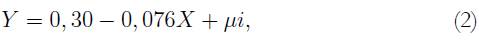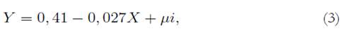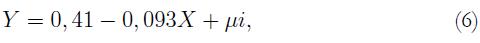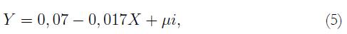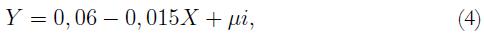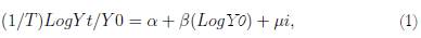 donde T es el número de años transcurridos entre el momento t y el momento 0, Y es la variable de interés (cualquiera de las anteriormente descritas), la expresión Yt/Y0 se refiere a una tasa de crecimiento, y μi son los errores del modelo.