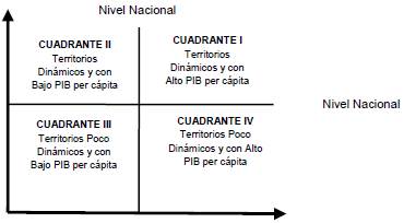 En el gráfico, la línea vertical representa la media del logaritmo del nivel inicial de la variable que se esté examinando, y la línea horizontal representa la media de la tasa de crecimiento del periodo de la variable estudiada. Cuando se cruzan la línea vertical y la línea horizontal en el gráfico se forman 4 cuadrantes. Así, el cuadrante I representa las regiones prósperas, ya que superan la media del nivel inicial y la media de la tasa de crecimiento; el cuadrante II es uno de los cuadrantes convergentes, porque relaciona las regiones con niveles iniciales bajos pero que crecieron mucho por encima de la media del periodo; el cuadrante III representa las regiones rezagadas porque iniciaron niveles inferiores de la variable estudiada y durante todo el periodo crecieron muy poco, es decir, por debajo de la media departamental; y el cuadrante IV es una región convergente, porque allí se ubican las regiones que tuvieron niveles iniciales muy altos pero que crecieron por debajo de la media departamental.