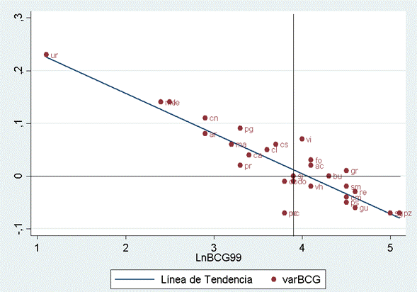 Leyenda: varBCG (variación o tasa de crecimiento de la cobertura del BCG 1999-2010), LnBCG99 (Logaritmo natural de la cobertura del BCG del año 1999).