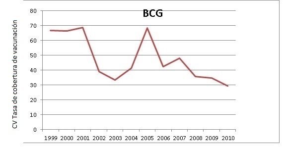 El Gráfico 11 muestra el coeficiente de variación (cv) de la tasa de la cobertura de vacunación del BCG de 1999 al 2010. Se observa que la disparidad entre municipios del Meta tiende a disminuir en el tiempo, por lo cual se evidencia convergencia sigma para la variable.