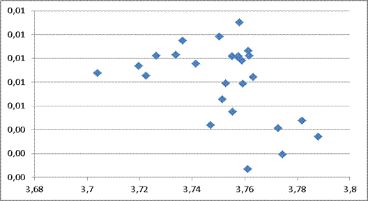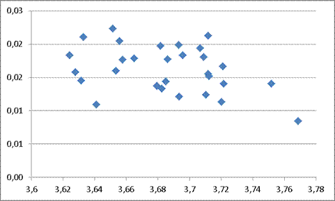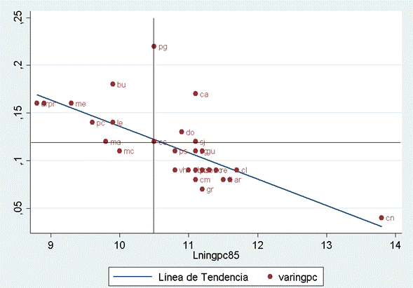 En un modelo de regresión, al explorarse los datos mediante gráfico se espera que estos estén cerca de la recta de regresión, si la relación entre las variables es inversa, como lo indica la teoría de la convergencia regional, los datos ajustados a la recta pasarían por los cuadrantes II y IV.