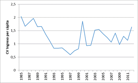 El Gráfico 13 muestra el coeficiente de variación (cv) del ingreso per cápita de 1985 al 2012. Se observa que la disparidad entre los municipios del Meta se redujo entre 1985 y 1997, pero luego comenzó a aumentar hasta el 2012. Se evidencia convergencia sigma hasta 1997 a nivel municipal en el Meta.