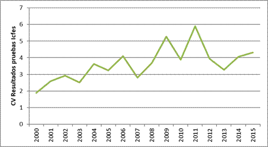 El Gráfico 16 muestra el coeficiente de variación (cv) de los resultados de las pruebas Icfes de los años 2000 al 2015. Se observa que la disparidad entre municipios del Meta tiende a aumentar en el tiempo, por lo que no se evidencia convergencia sigma.