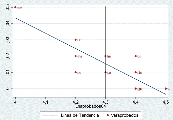 En el Gráfico 17 se observa la relación entre el logaritmo del porcentaje de alumnos aprobados en el año 2004 en el eje X y su tasa de crecimiento en el eje Y. También se observa que los datos municipales se encuentran cercanos a la línea de tendencia y que la mayoría de los municipios del Meta se encuentran en los cuadrantes II y IV, lo cual corrobora la convergencia regional en el indicador. Como se explicó en la sección de la metodología, el cuadrante I representa las regiones prósperas, en las que se encuentran los municipios del Cabuyaro y El Dorado. No se observan datos en el cuadrante III del gráfico.