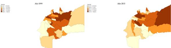 Como indicador de salud se cuenta con la cobertura de vacunación del BCG en el periodo 1999-2010 a nivel municipal en el departamento del Meta. El Gráfico 2 muestra los mapas de quintiles de la Cobertura de Vacunación del BCG a nivel municipal del Meta, el mapa de la izquierda representa la cobertura del año 1999 y el mapa de la derecha la cobertura del año 2010.