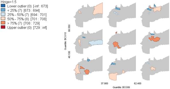 En el Gráfico 3 se observan 9 mapas condicionales que comparan la cobertura de vacunación del BCG de los años 1999 y 2010. En general se observa que los municipios se distribuyen de manera uniforme en los 9 mapas. 11 de los 29 municipios se encuentran ubicados en la diagonal, y los 18 restantes cambiaron de nivel durante el periodo, sin observarse algún patrón de distribución espacial en el departamento.