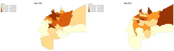 El Gráfico 4 muestra los mapas de quintiles de los ingresos per cápita a precios del año 2012 a nivel municipal del Meta: el mapa de la izquierda representa los ingresos per cápita del año 1985 y el de la derecha los del 2012.