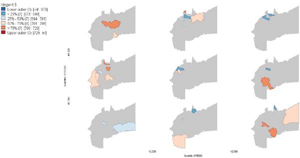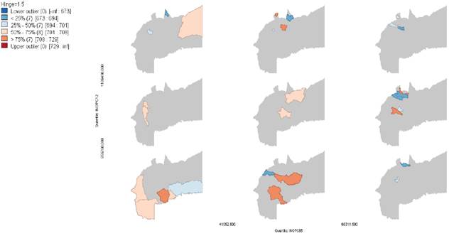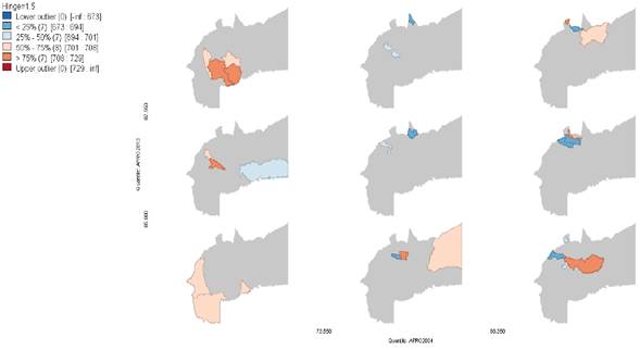 El análisis de cada variable concluye con un mapa condicional (el cual se representa en un gráfico que contiene 9 mapas) que mide en el eje X el año inicial de cada variable por niveles: los 3 mapas ubicados en la columna izquierda representan los municipios de nivel inferior, es decir, los de menores valores según la variable; la columna intermedia refleja valores medios; y la columna derecha refleja los más altos valores de la variable. En el eje Y se mide el año final de cada variable: así, la fila superior representa los de mayor valor, la fila intermedia los de valores medio y la fila inferior los de menor valor; de esta manera cada uno de los 9 mapas representa un nivel para el año inicial y otro nivel en el año final, lo que permite analizar los municipios que cambiaron de niveles en el periodo estudiado.