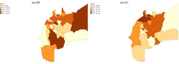 Para el AEED se utilizó el software GEODA que permitió localizar a los municipios por quintiles según los datos. Para todas las variables se generan los gráficos del año inicial y del año final.