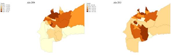 El Gráfico 8 muestra los mapas de quintiles del porcentaje de estudiantes del Meta aprobados a nivel municipal. El mapa de la izquierda representa los resultados de los porcentajes de estudiantes aprobados en el año 2004 y el de la derecha los aprobados en el 2013.