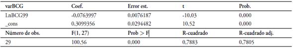 En la Tabla 1 Se presenta la estimación del modelo de convergencia con la variable Cobertura del BCG para el periodo 1999-2010 como se muestra a continuación.