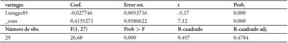 En la Tabla 2 Se presenta la estimación del modelo de convergencia con el Ingreso per cápita para el periodo 1985-2012 como se muestra a continuación.
